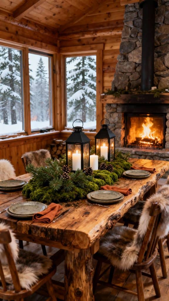 Winter woodland cabin scene with a log dining table displaying a moss and pine centerpiece with lanterns and a stone fireplace in the background