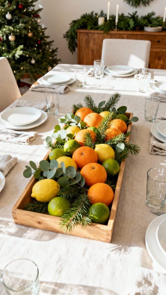 Christmas brunch living room with a cheerful centerpiece of fresh citrus and greens placed on a coffee table in a bright, festive atmosphere