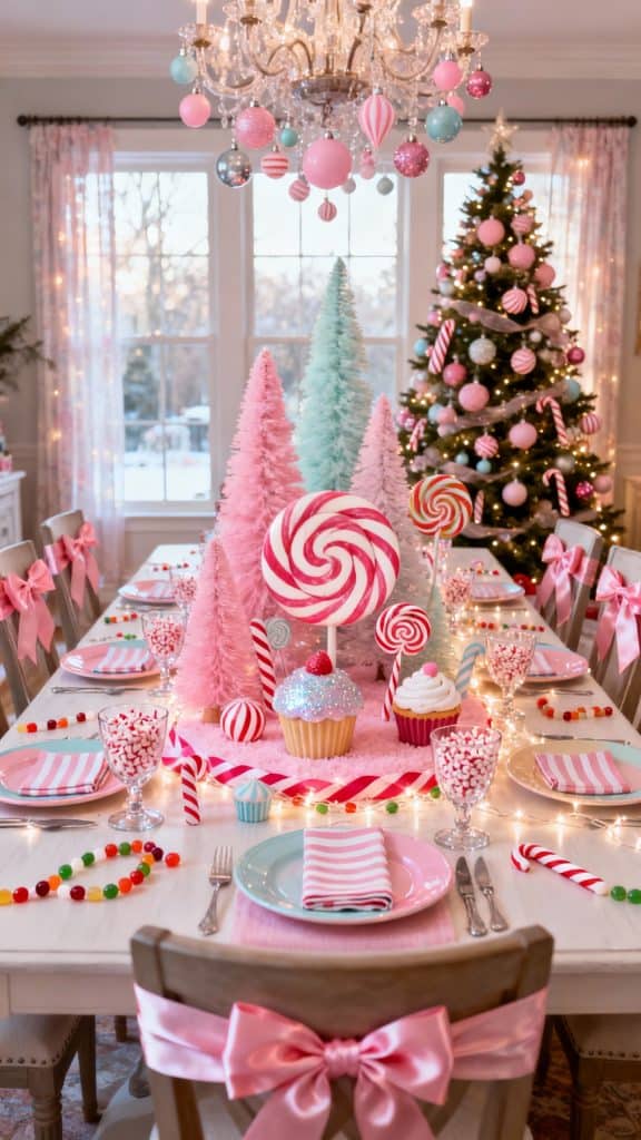 Whimsical candyland theme with a pink and pastel centerpiece surrounded by cupcake decor, peppermint stripes, and playful holiday cheer
