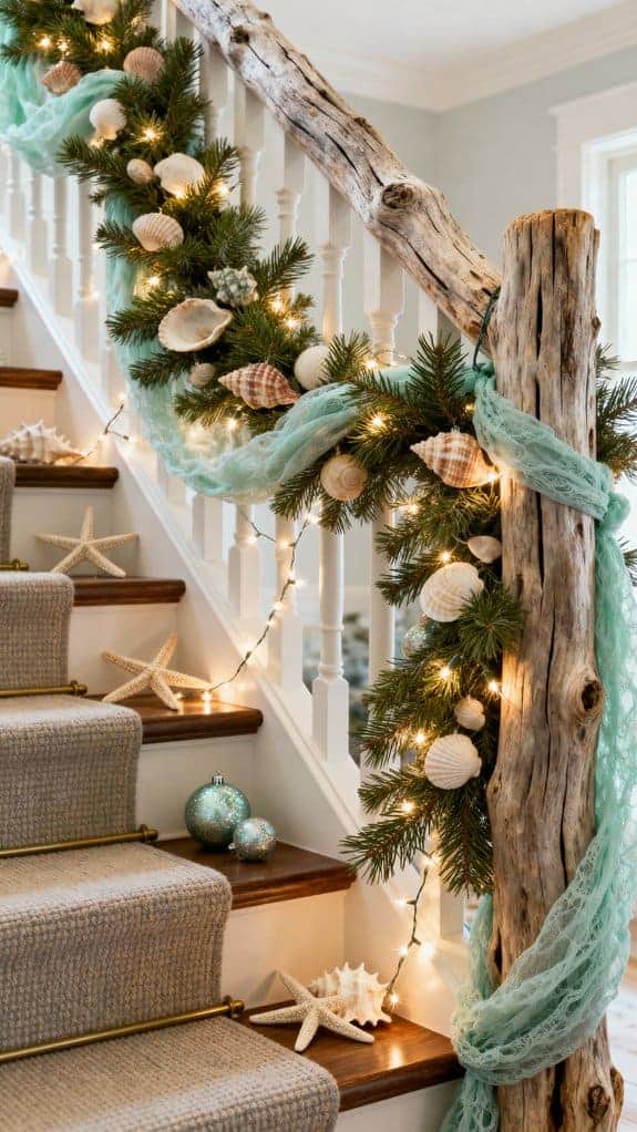 Coastal Christmas Staircase With Driftwood Texture, Soft Seafoam Green, And Shell-Infused Pine Garland