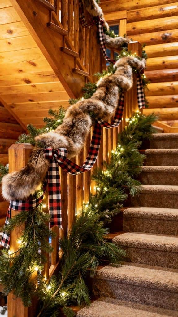 Holiday Cabin Staircase With Buffalo Check, Cozy Faux Fur Layers, And Natural Pine Texture Everywhere