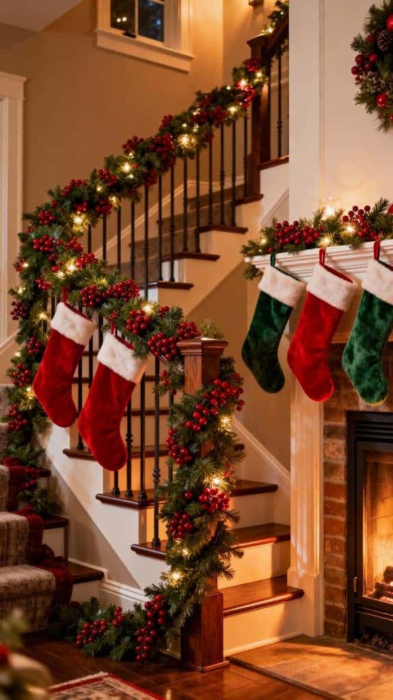 Many people love decorating their staircases with red-and-green colors during the holidays. The plush stockings and berry garlands make it feel warm and cozy.