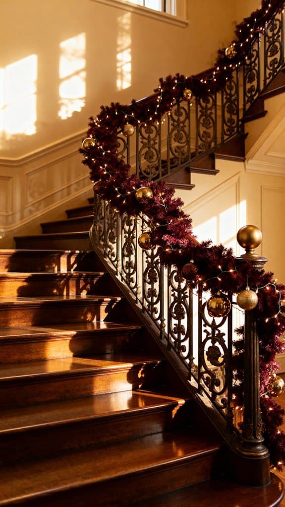 Classic Victorian Staircase With Ornate Banisters, Deep Burgundy Garland, And Antique Brass Ornaments