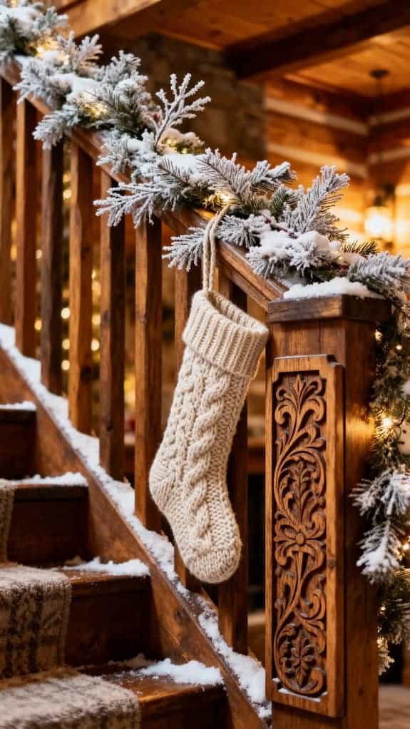 The staircase looks really nice with chunky knit stockings hanging on it.