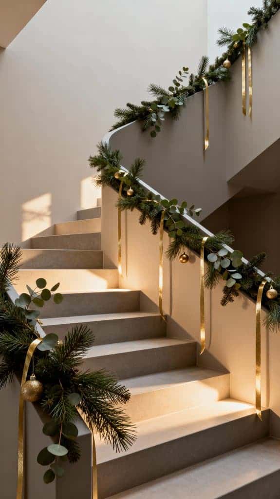 Neutral Modern Staircase Adorned With Minimal Greenery, Soft Gold Accents, And Warm Ambient Lighting