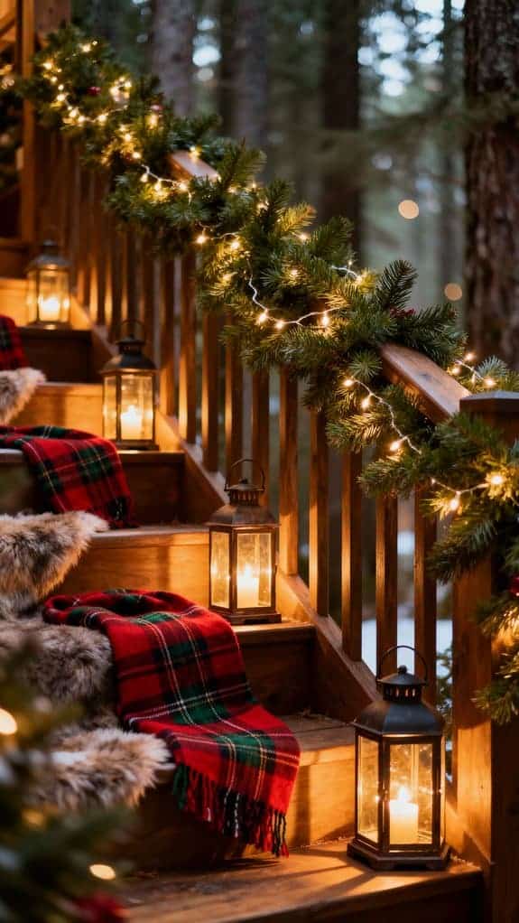 Cozy Woodland Staircase With Pine Garlands, Soft Lantern Glow, And Plaid Throws Draped Along The Steps