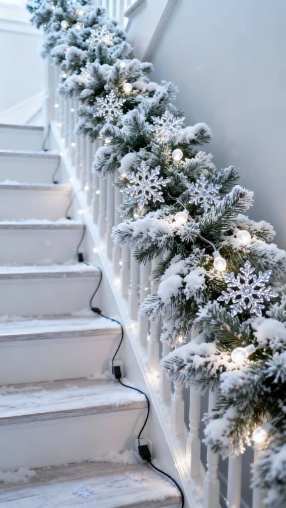 Snowy Winter Wonderland Staircase With Flocked Greenery, Crystal Snowflakes, And Frosty White LED Glow