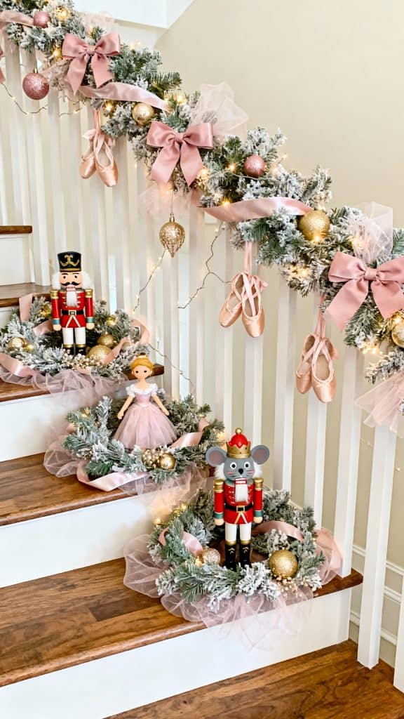 Nutcracker Ballet Staircase With Character Figurines, Stage-Style Garland, And Soft Ballet Pink Accents
