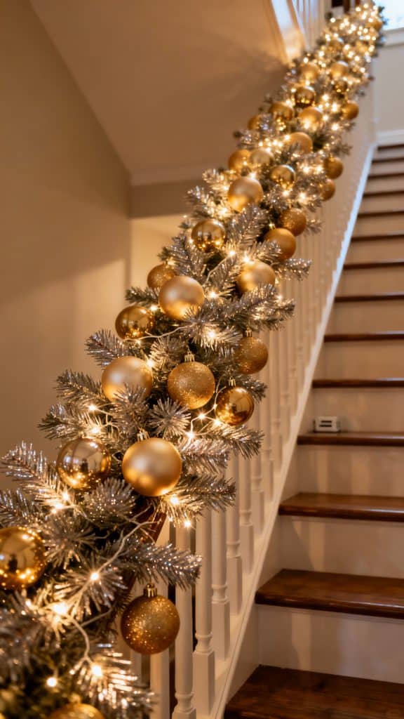 Glam Gold Staircase With Metallic Pine, Champagne-Tone Baubles, And Shimmering Twinkle Lights