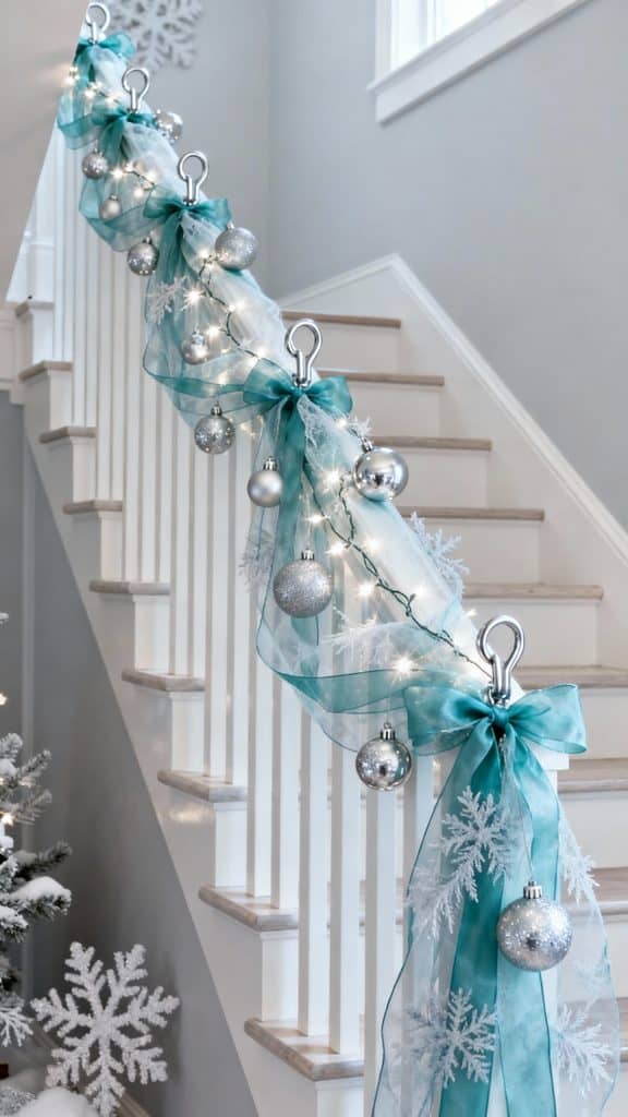 The Blue Frost staircase looks super pretty with icy teal ribbons and shiny silver ornaments.