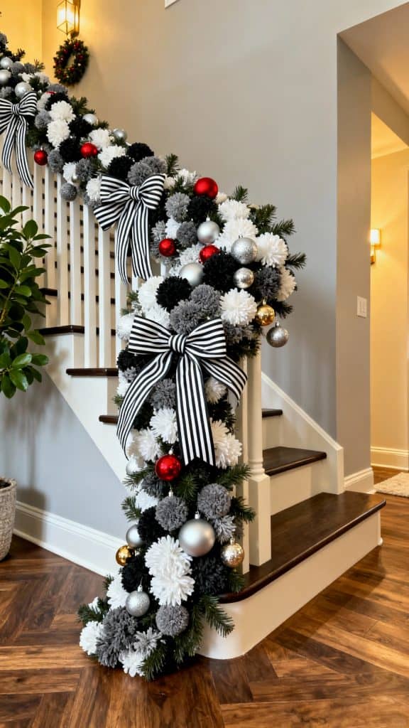 Black-And-White Chic Staircase With Monochrome Garland, Striped Ribbon, And Minimal Holiday Drama
