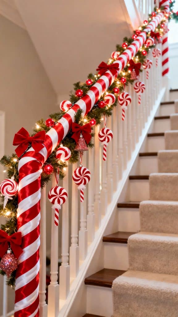 This candy-cane staircase is super fun and makes the whole house feel like a holiday party! People love it because it looks bright and cheerful with the red and white stripes and lights.