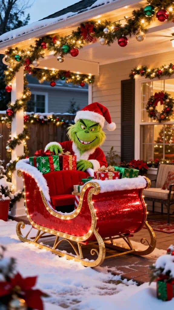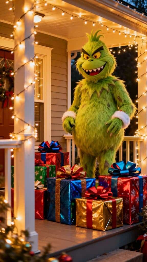 Surround your Grinch with colorful gift boxes, adding a playful touch to your porch decorations. Opt for various sizes to create visual interest and dimension. Twinkling lights are a must—they’ll illuminate your display, casting a magical holiday glow come nightfall.