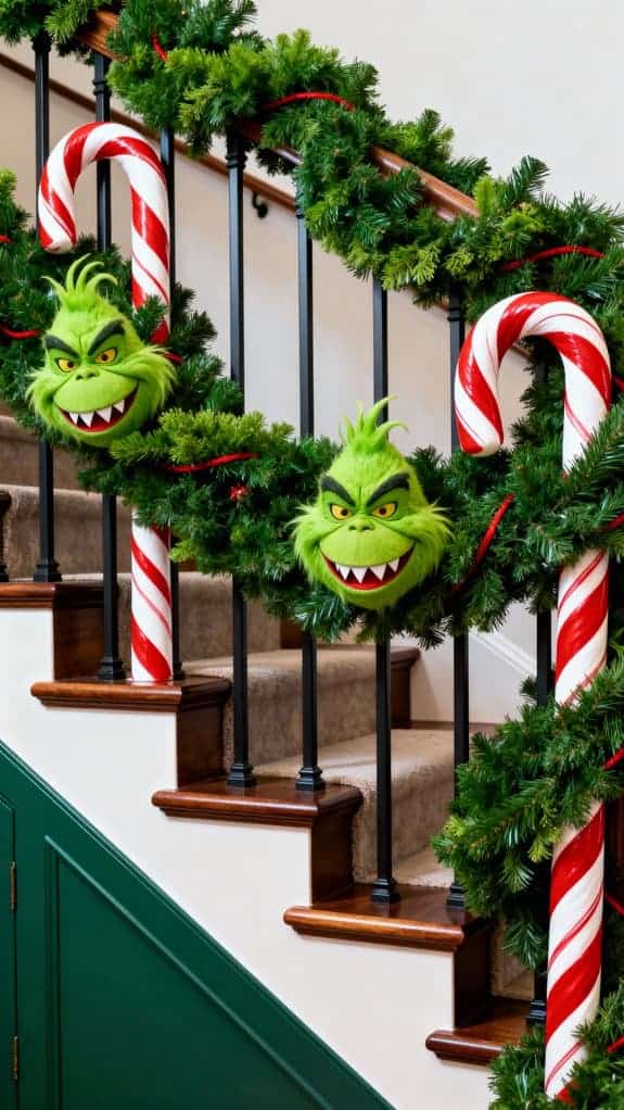 Staircase Wrapped In Green Garland, Candy Canes, And Grinch Faces