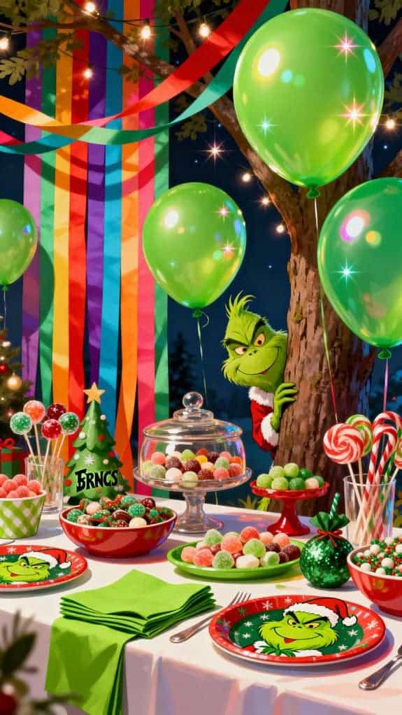 Start by hanging festive streamers in bold reds and greens, cascading from the ceiling to mimic the magical Whoville atmosphere. A treat table, overflowing with colorful sweets and snacks, captures the whimsical spirit of the season.