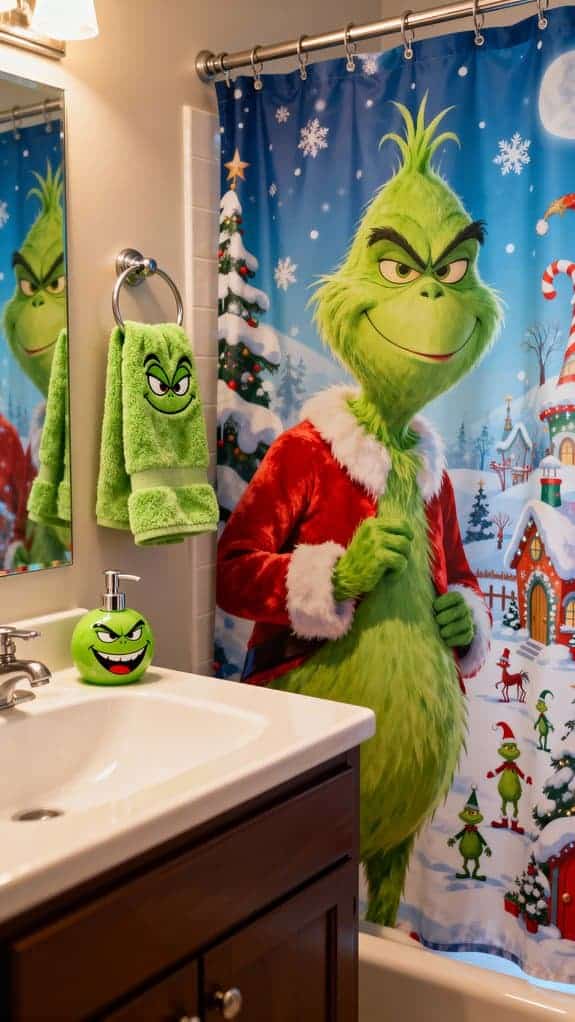 Start with a bold Grinch shower curtain featuring the iconic character in all his green glory. It’s sure to make every shower an adventure.