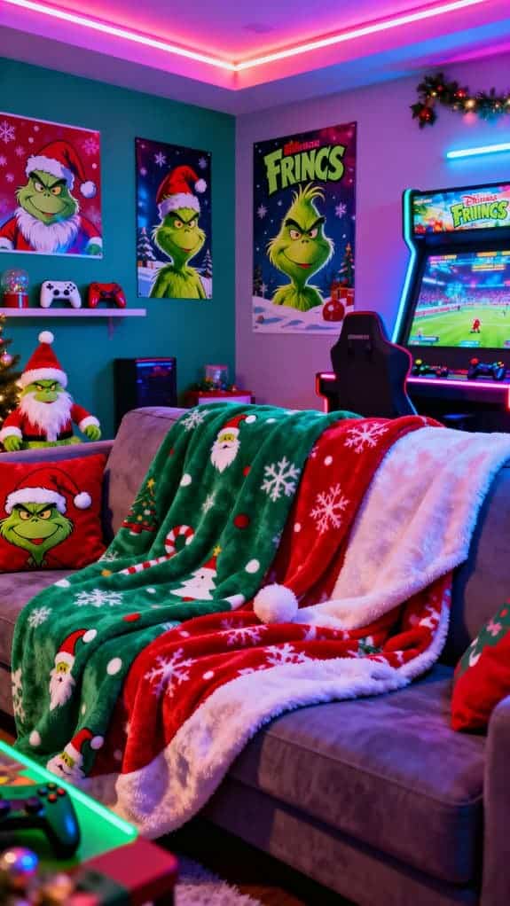 Cozy blankets are draped over plush seating areas, inviting you to snuggle up and enjoy the holiday spirit. These blankets, featuring the Grinch’s mischievous grin, add warmth and comfort as you dive into your favorite games.