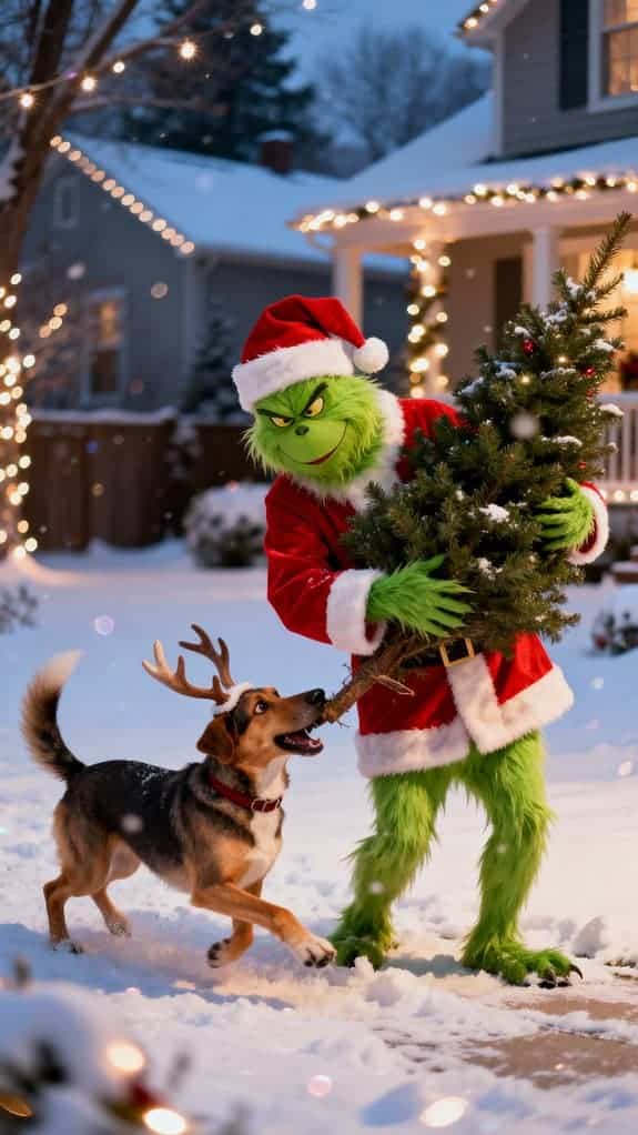 Before you stands a whimsical snowy front yard scene, capturing the mischievous spirit of the Grinch and his loyal companion, Max the Dog. The Grinch, with his signature green fur and sly grin, is up to his old tricks. In his hands, he clutches a stolen Christmas tree, its twinkling lights casting colorful reflections on the snow.