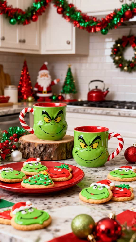 Playful Kitchen With Whoville-Themed Cookies, Mugs, And Red-Green Accents