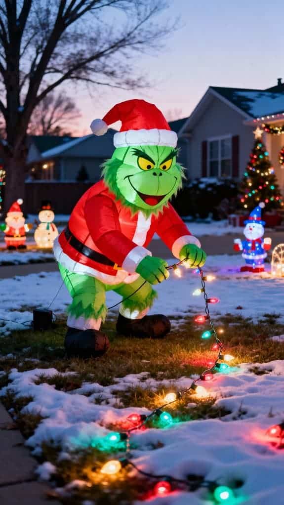 The Grinch characterizations are spot-on, bringing Dr. Seuss’s classic tale to life. Your neighbors will chuckle at this playful nod to holiday mischief.