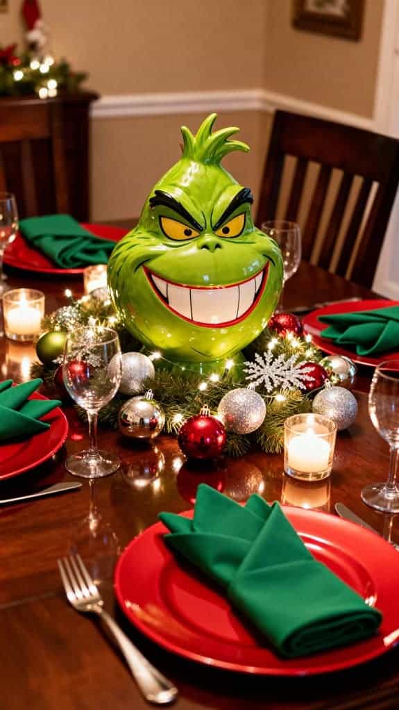 Create an enchanting holiday atmosphere in your dining room with a Grinch-themed centerpiece, complemented by green napkins and red tableware.