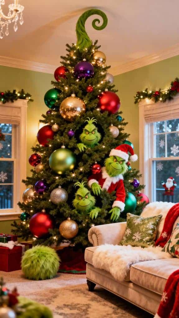 Don’t stop there—scatter similarly large ornaments around the room to create a cohesive Whoville wonderland. This setting invites family and friends to gather in a space that feels straight from the pages of the Grinch’s story, ensuring your holidays are extra fun.