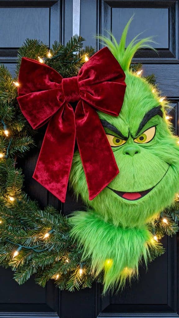 The wreath’s vibrant green hue and fuzzy texture are reminiscent of the Grinch himself, making it an eye-catching piece for anyone passing by.