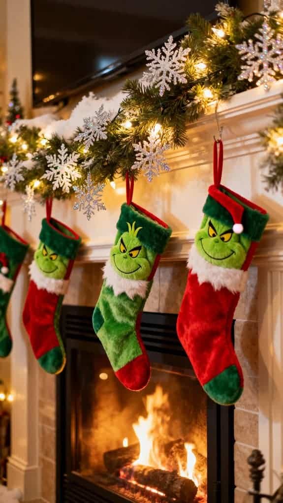 Start by hanging Grinch stockings in vibrant green and red hues, adding a playful touch. These stockings, adorned with mischievous Grinch faces, are sure to bring smiles to everyone who sees them.