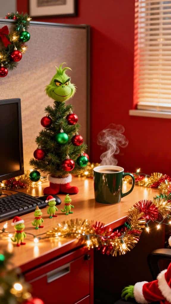 Adorn the tree with mini Grinch crafts like tiny ornaments and green garlands, adding a whimsical touch. Pair this with a Grinch-themed coffee mug that keeps your drinks merry and bright throughout the workday.