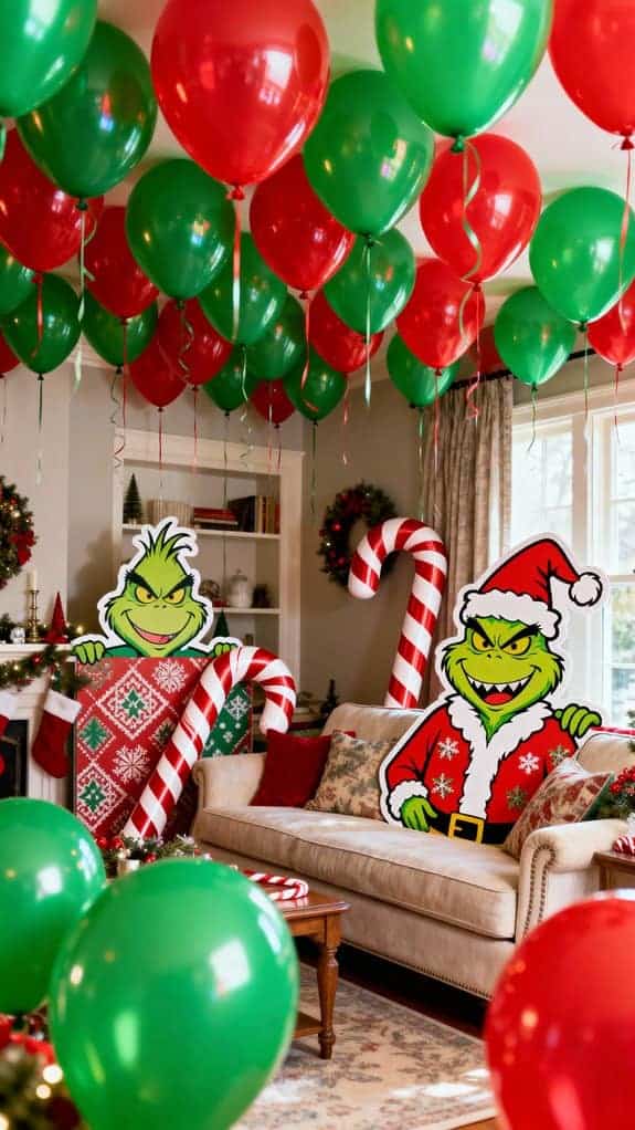 Whimsical Living Room With Green And Red Balloons, Grinch Cutouts, And Candy Canes