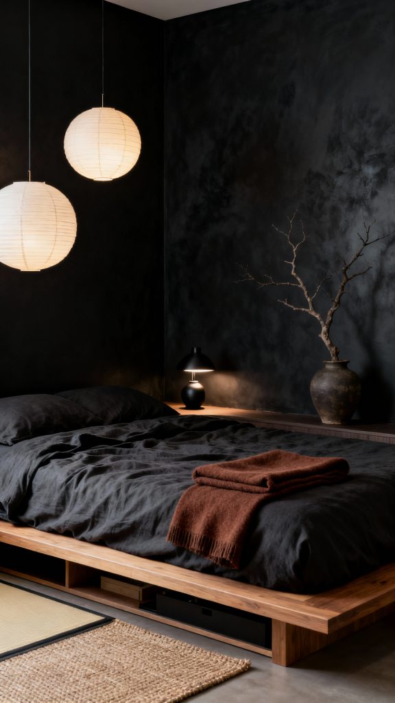 Lighting stays quiet—paper lantern pendants and a tiny black ceramic lamp. A branch in a clay vase, tatami-style rug, and hidden storage keep it serene, intentional, and deeply restful.