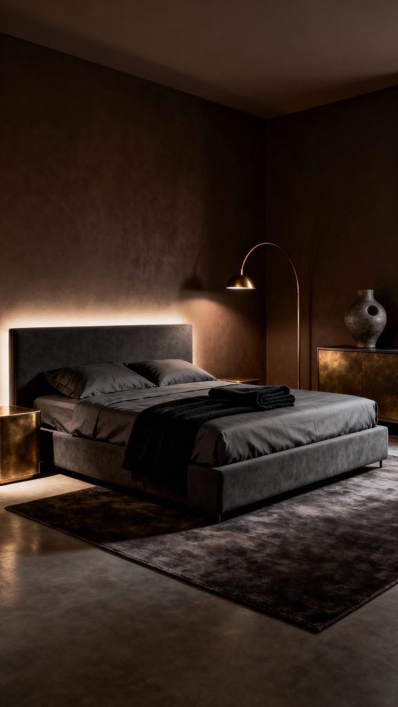 Use uplighting behind the headboard and a single bronze arc lamp. A large tonal rug and one sculptural ceramic piece on the dresser make every line deliberate and sexy.
