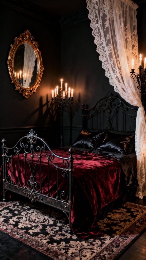Style a burgundy velvet coverlet, black satin pillows, and a damask rug underfoot. A gilt-framed oval mirror becomes the room’s jewel, reflecting candle flicker beautifully.