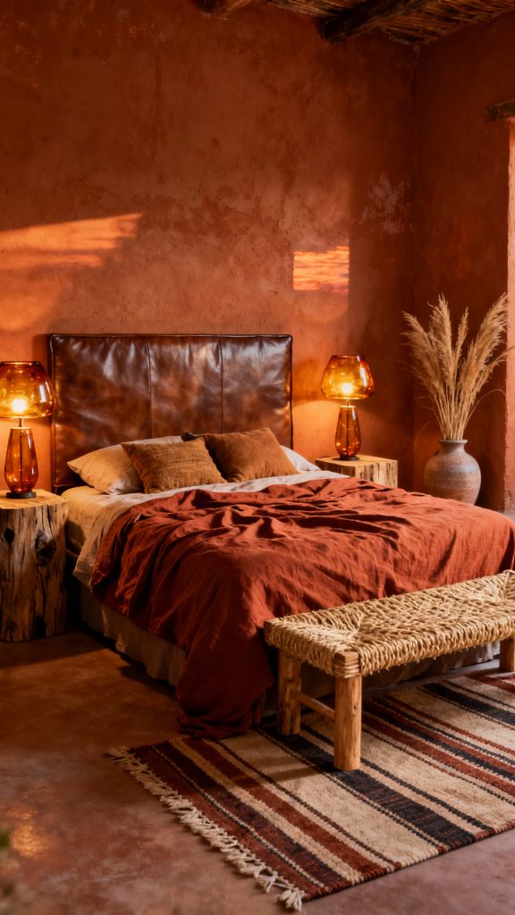 Go for clay-colored walls with a burnt terracotta undertone that warms the whole space. Keep furniture earthy: leather headboard, raw wood side tables, and a woven jute bench.