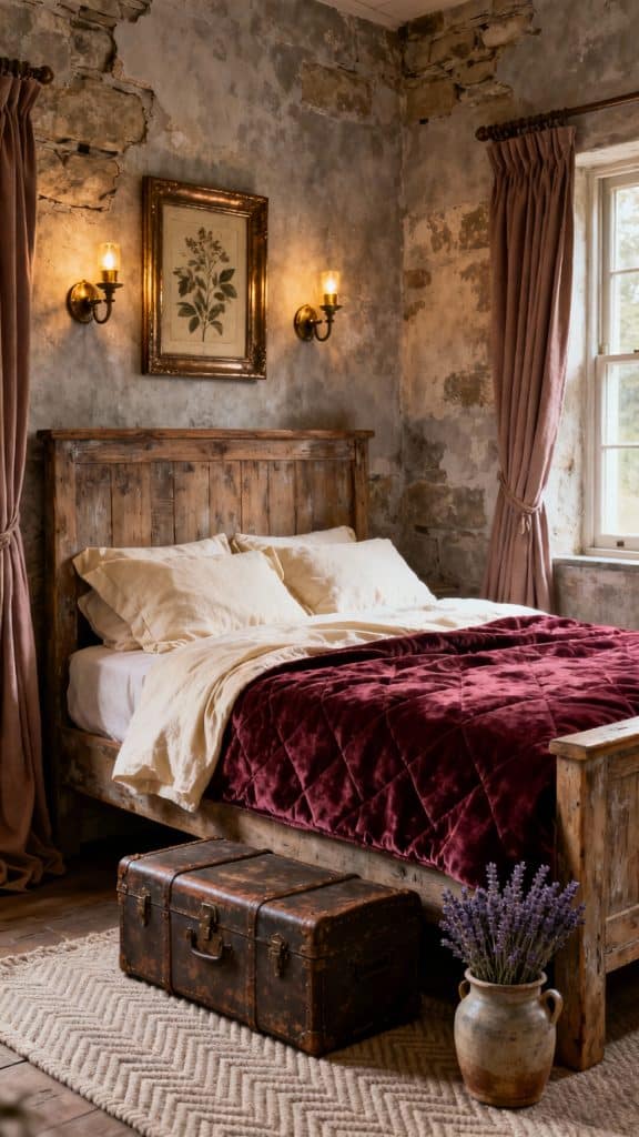 Channel a countryside castle: warm greige walls, a stone-look plaster finish, and a weathered oak bed. Dress it in cream linen sheets with a bordeaux velvet quilt and bronze-framed botanical prints.