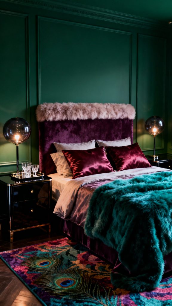 Create a jewel-toned cocoon with emerald walls and an aubergine velvet headboard. Layer in garnet silk cushions and a teal mohair throw for that rich, touchable contrast.