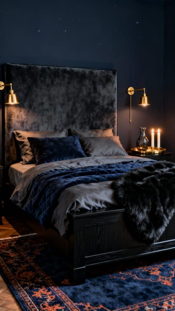 Start with inky navy walls and a charcoal velvet headboard that looks like a night sky you can sink into. Add antique brass swing-arm sconces for that low, golden sheen, and keep bedding tonal: slate linens, a deep sapphire quilt, and a black faux fur throw at the foot.