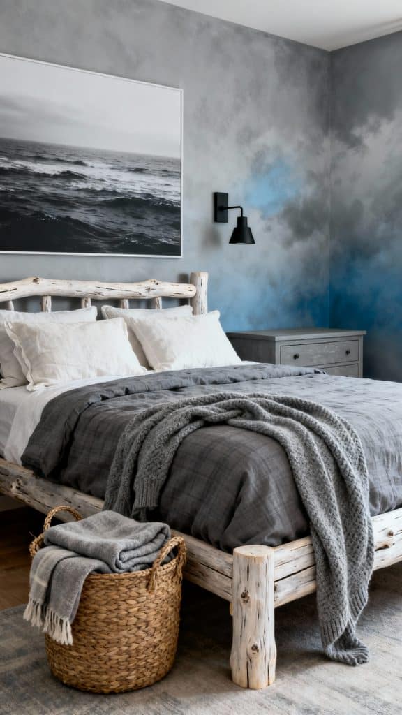 Walls go a soft storm-cloud gray with a hint of blue, paired with a bleached driftwood bed. Keep textiles layered and tactile: slate flannel sheets, a fog-gray knit throw, and off-white linen euro shams.