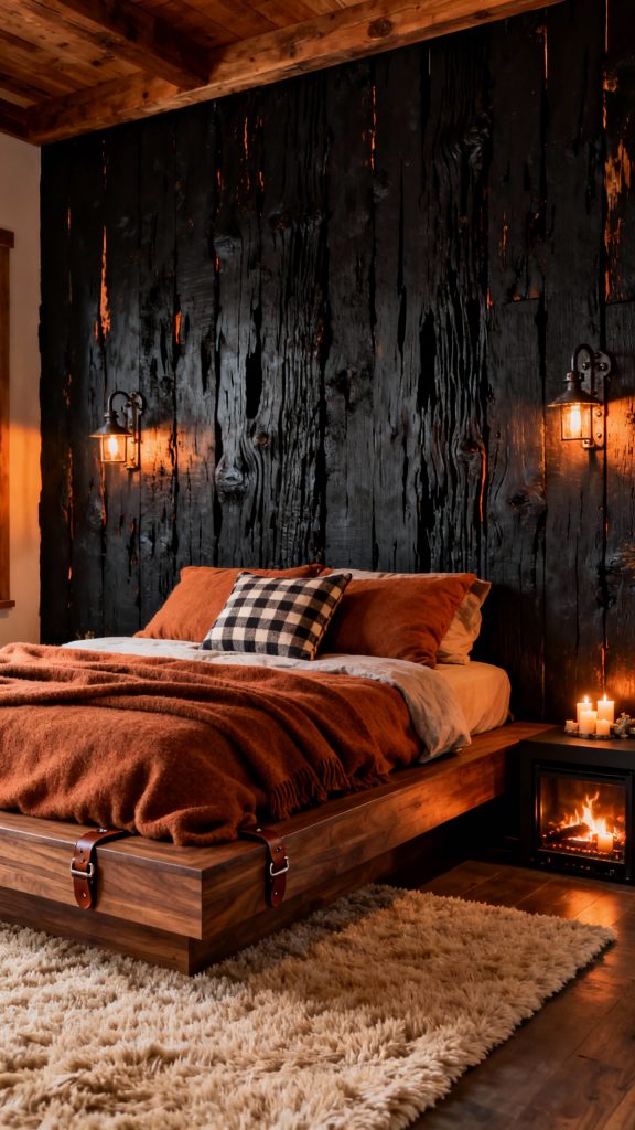 Go cabin, but make it chic: shou sugi ban-style black wood accent wall and warm amber lighting. Choose a platform bed in walnut with cinnamon-toned wool blankets and a buffalo-check accent pillow (just one!).
