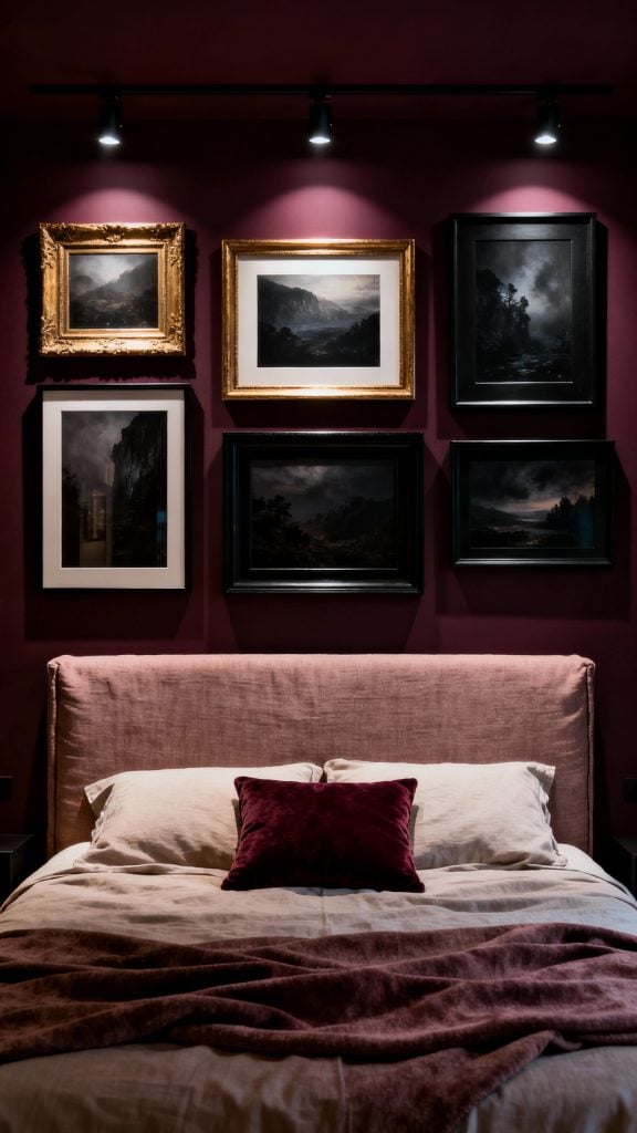 Keep the bed simple—linen slipcovered headboard in mushroom—and let gallery spotlights handle the drama. A sable throw and oxblood velvet cushion nod to the walls without overwhelming.