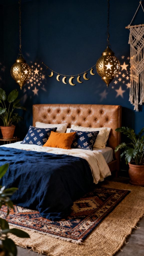 Hang a brass moon phase garland over the headboard and use pierced metal lanterns for starry shadows. Plants in terracotta pots and macramé hangers bring in soft, organic curves.