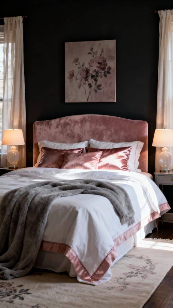 Choose opal glass bedside lamps, a delicate floral artwork in muted tones, and airy ivory drapes. A pale rug with a faint vintage pattern keeps it light while the darker walls ground the romance.