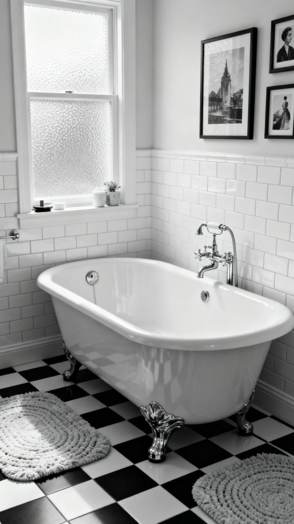 Black-And-White Small Bathroom With Clawfoot Tub, Checkered Tile, And Timeless Vintage Charm
