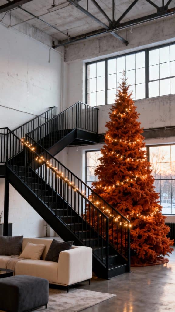 Modern Loft With Black Metal Staircase And Tall Burnt Orange Christmas Tree Draped In Amber Lights