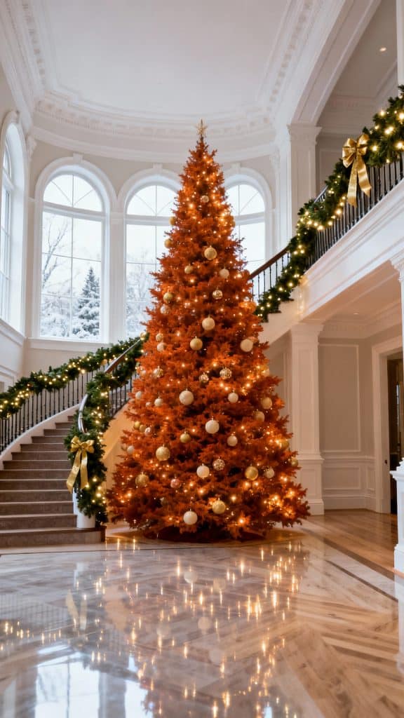 Elegant Entryway With Burnt Orange Christmas Tree Framed By Curved Grand Staircase And Warm Candle Lanterns