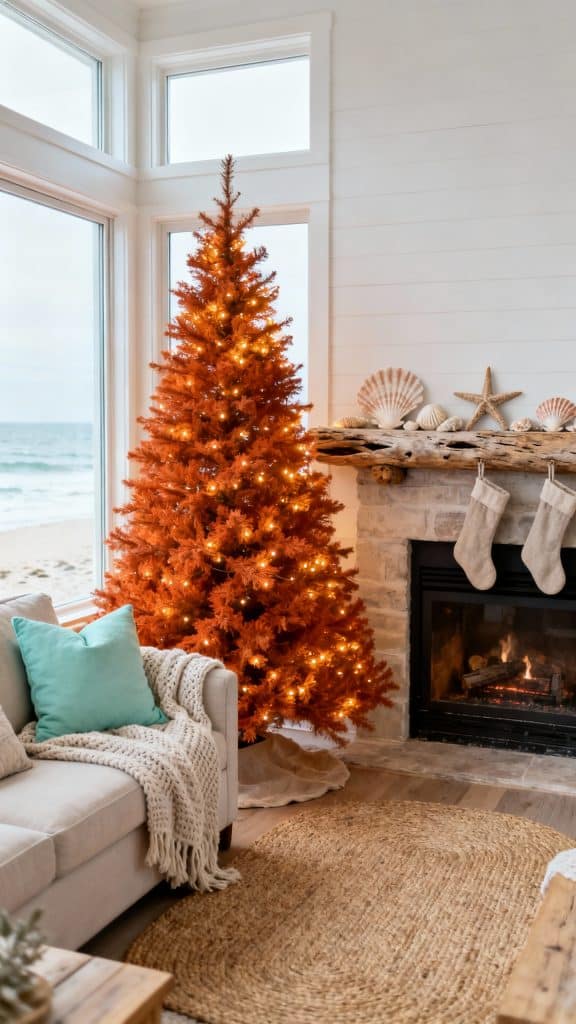 Coastal-Warm Living Space With Burnt Orange Tree, Driftwood Mantel, And Seafoam Pillows For Soft Contrast