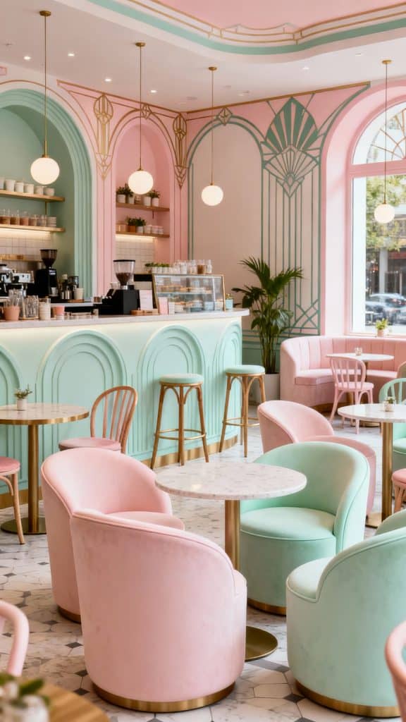 Decorating your cafe in an Art Deco style makes it look really special and beautiful! It creates a cozy and happy feeling that everyone will enjoy. I just love how the shiny details and soft colors can make a place feel so warm and inviting!