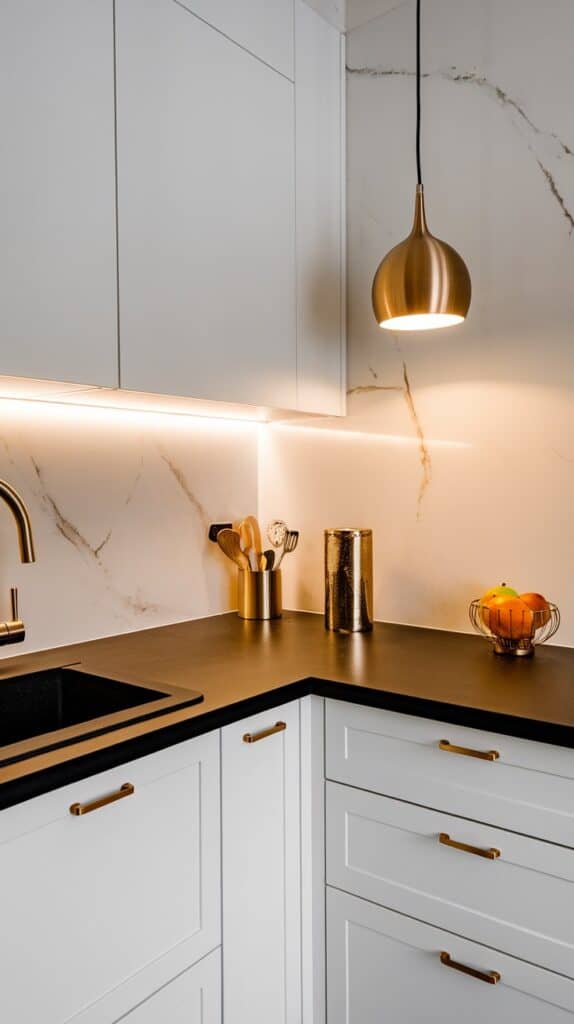 Want to make your kitchen look fancy? Try adding brushed gold or brass accents. These shiny metals look great with black countertops and make your kitchen feel warm and stylish.