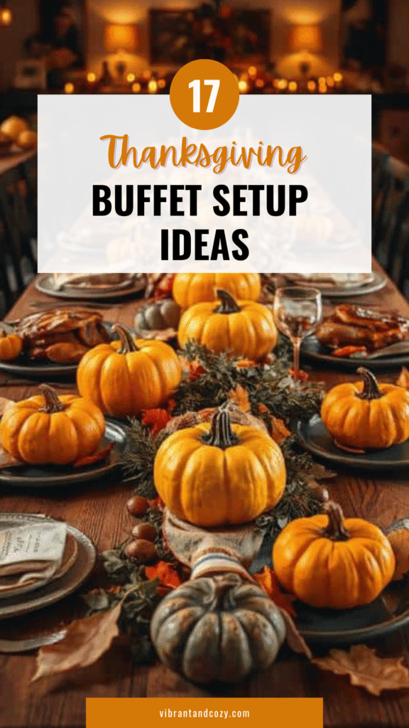 A plaid table runner with seasonal garland is a simple way to make your Thanksgiving buffet look nice. Choose plaid patterns with colors like red, orange, and yellow. These colors help create a warm and cozy vibe for your guests.