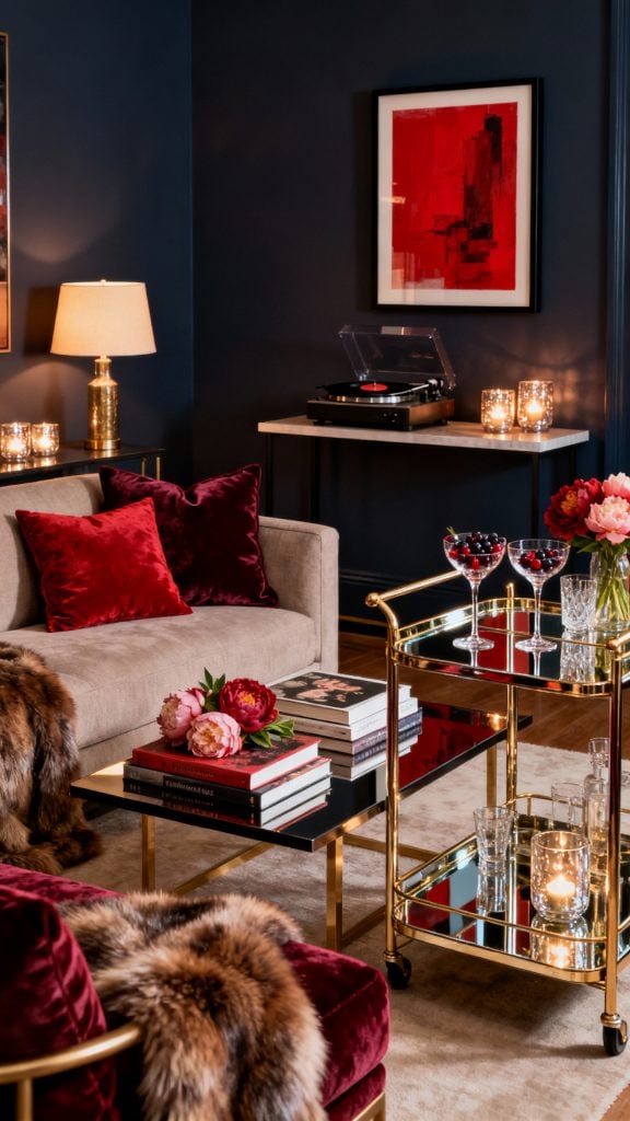 Dial up the drama with a sultry, lounge-inspired setup. This room leans luxe—vintage vibes, rich textiles, and a soundtrack that says “sip and stay awhile.” It’s the grown-up answer to hearts and roses.